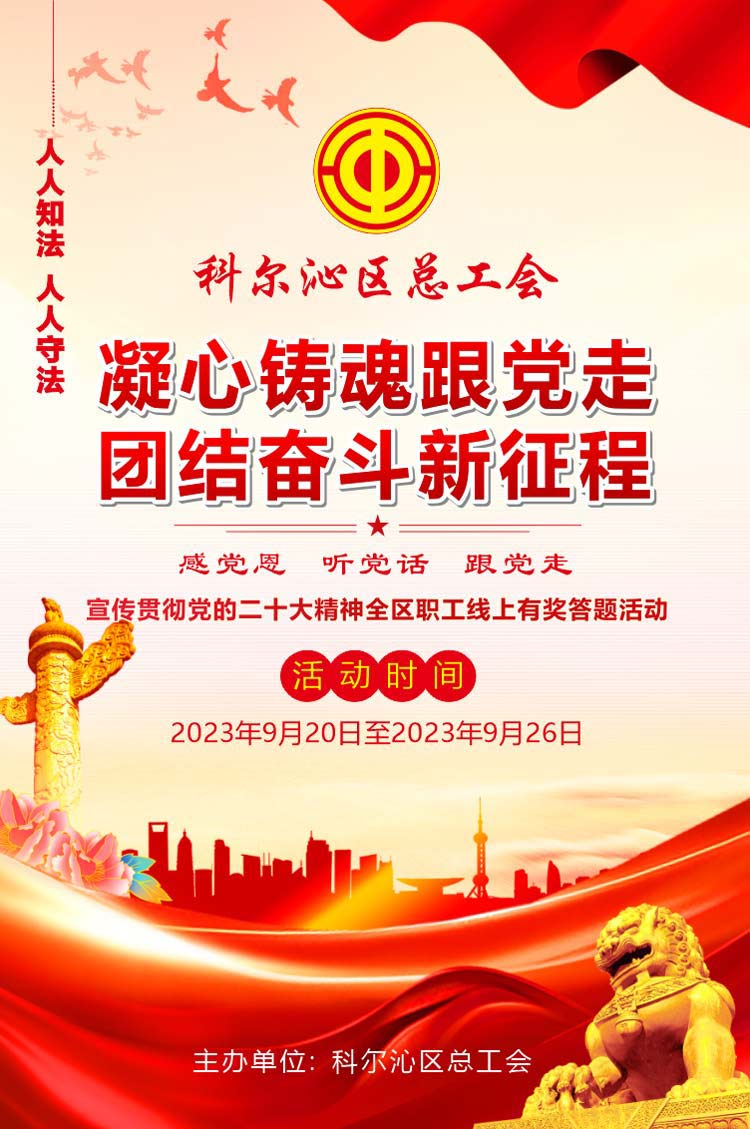 為進一步學習貫徹落實黨的二十大精神,教育引領廣大職工“感黨恩、聽黨話、跟黨走”,凝心聚力完成“五大任務”,全方位建設模范自治區(qū),提升廣大職工學法、知法、守法意識,形成“人人皆知、人人有責”的良好法治氛圍,科爾沁區(qū)總工會決定開展“凝心鑄魂跟黨走 團結奮斗新征程”宣傳貫徹黨的二十大精神暨全區(qū)職工線上有獎答題活動。