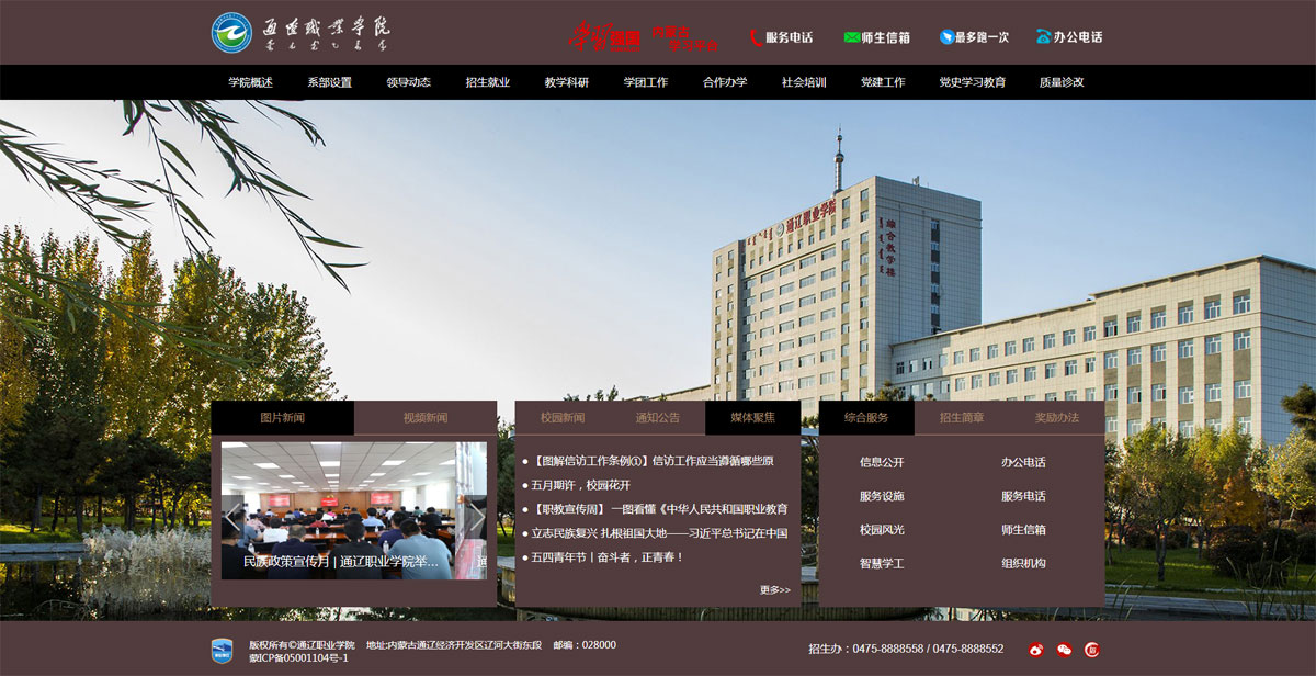通遼職業(yè)學(xué)院是一所公辦全日制綜合性普通高等院校,以舉辦高等職業(yè)教育為主,兼?zhèn)渲械嚷殬I(yè)教育、電大開放教育和社會(huì)培訓(xùn)職能。學(xué)院成立于 2004 年,由原哲盟師范學(xué)校、哲盟衛(wèi)生學(xué)校、哲盟教育學(xué)院、內(nèi)蒙古電大通遼分校合并組建而成,辦學(xué)歷史始于 1951 年。2009 年通過教育部高職高專人才培養(yǎng)工作評(píng)估,現(xiàn)為內(nèi)蒙古自治區(qū)示范性高等職業(yè)院校、自治區(qū)園林式單位、自治區(qū)文明校園,是中國(guó)教育發(fā)展戰(zhàn)略學(xué)會(huì)產(chǎn)教融合專業(yè)委員會(huì)常務(wù)理事單位、全國(guó)高職高專校長(zhǎng)聯(lián)席會(huì)成員單位。